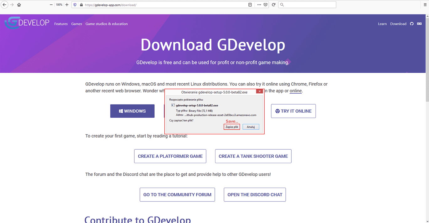 To get your copy of GDevelop you can visit the Download page where distributions for Windows, Mac OS, and Linux are available.